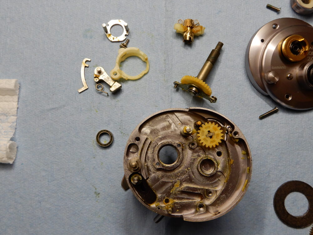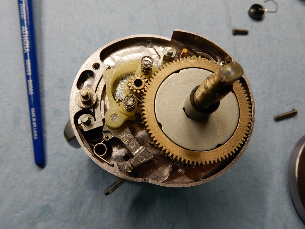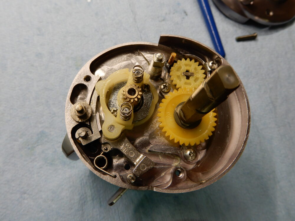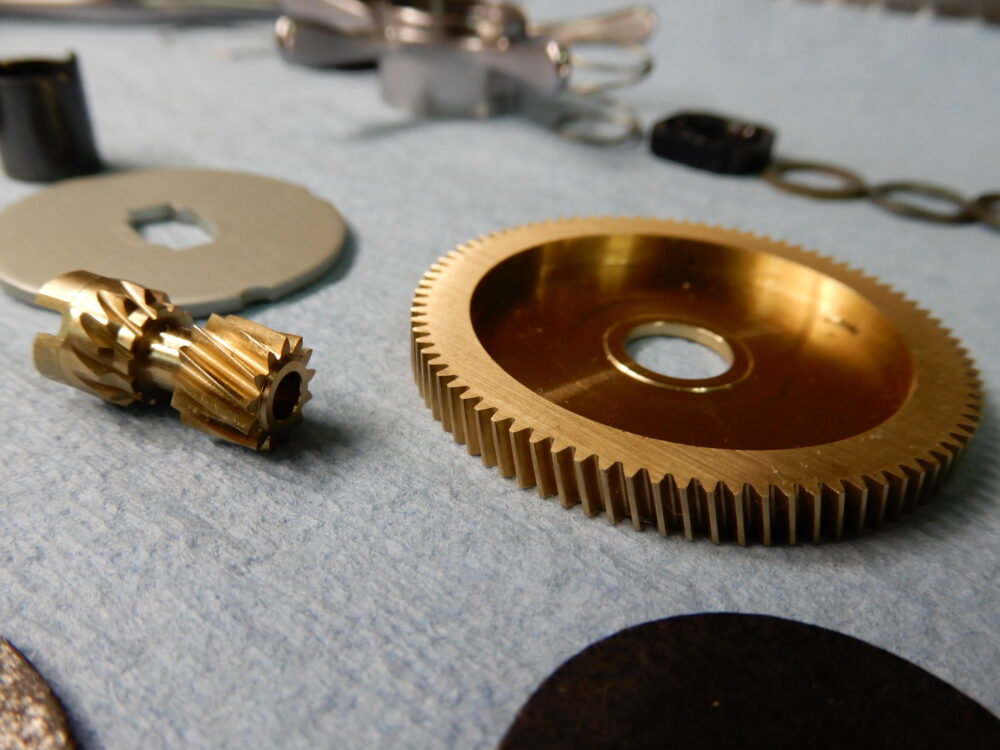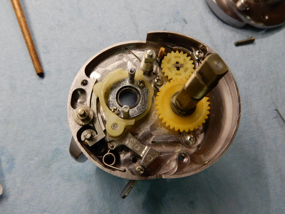 メインギア軸、ピニオンギア、クラッチカム等、取り外しました。