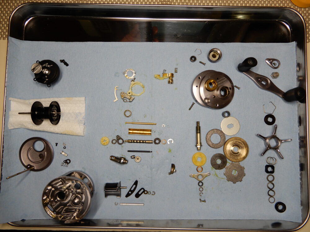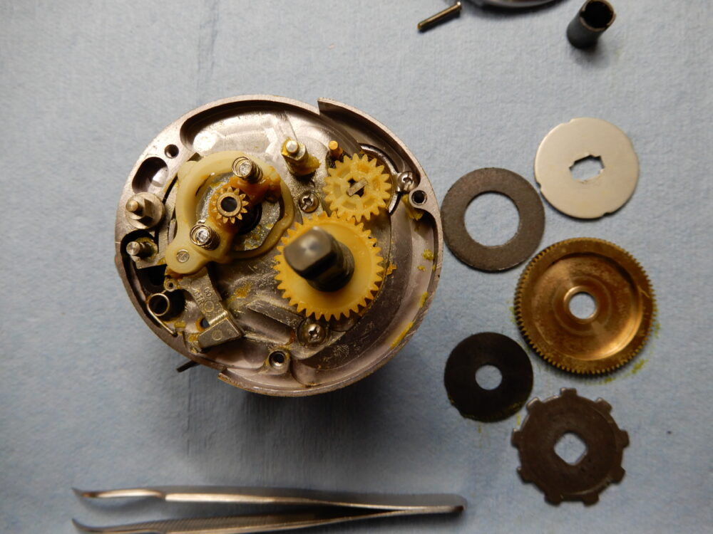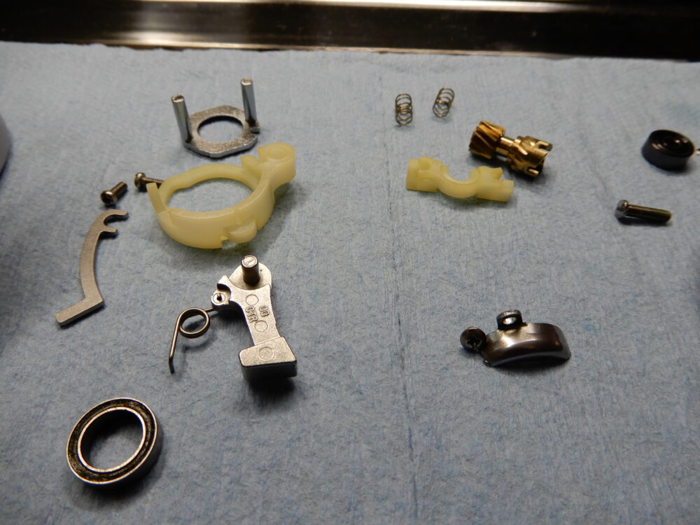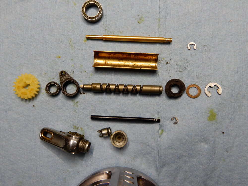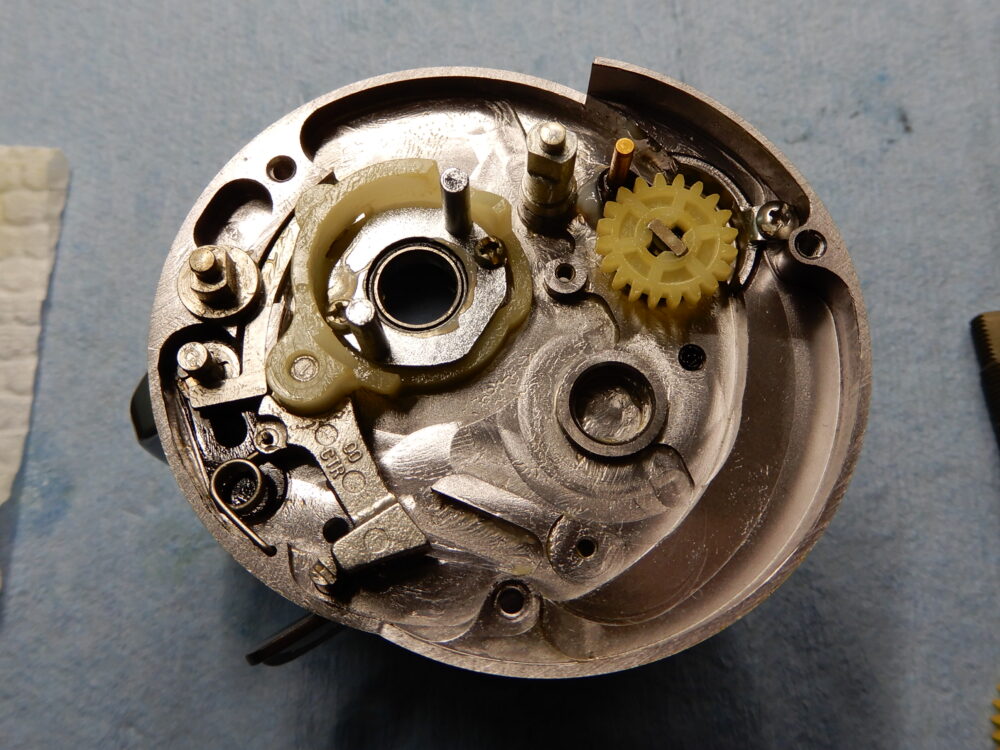 メインギア軸、ピニオンギア、クラッチカム等、取り外しました。