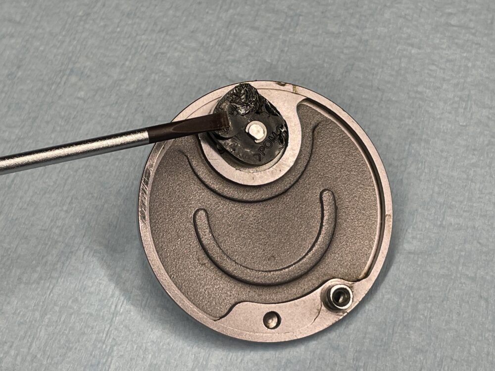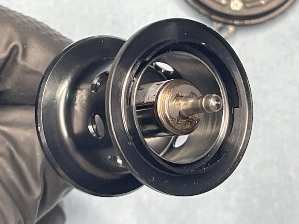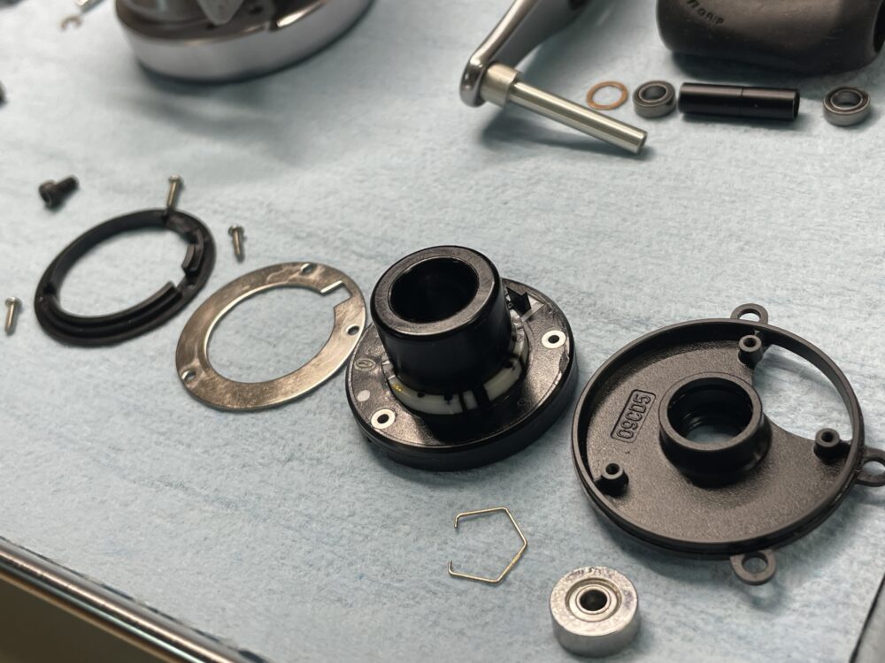 分解前の点検でドラグ音が鳴りませんでしたが、この構造だと、スプールを押さえてハンドルを回してもドラグ音は鳴りませんね。クラッチが入った状態でスプールが回転した時だけドラグ音が出る構造です。