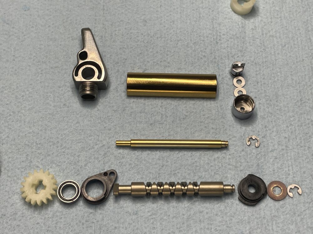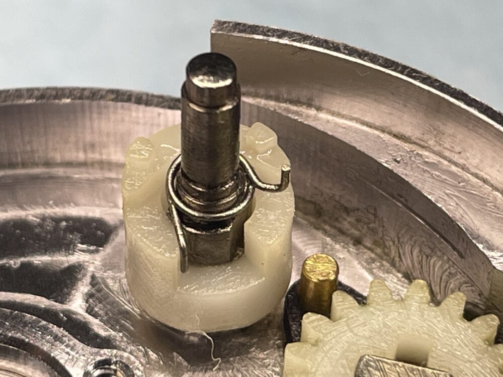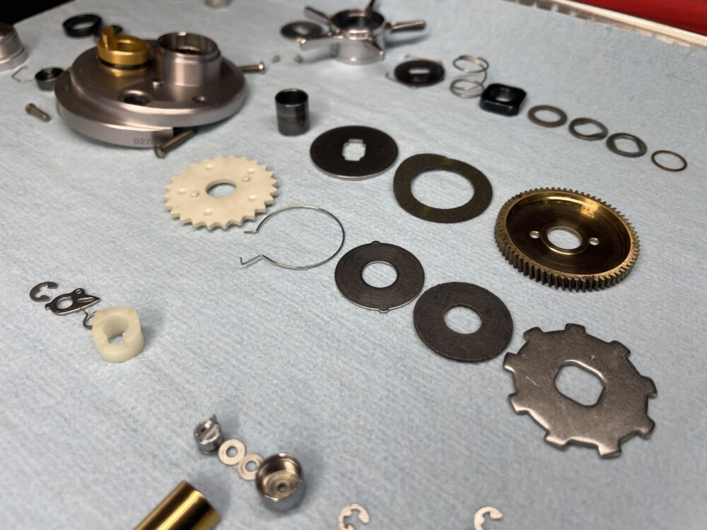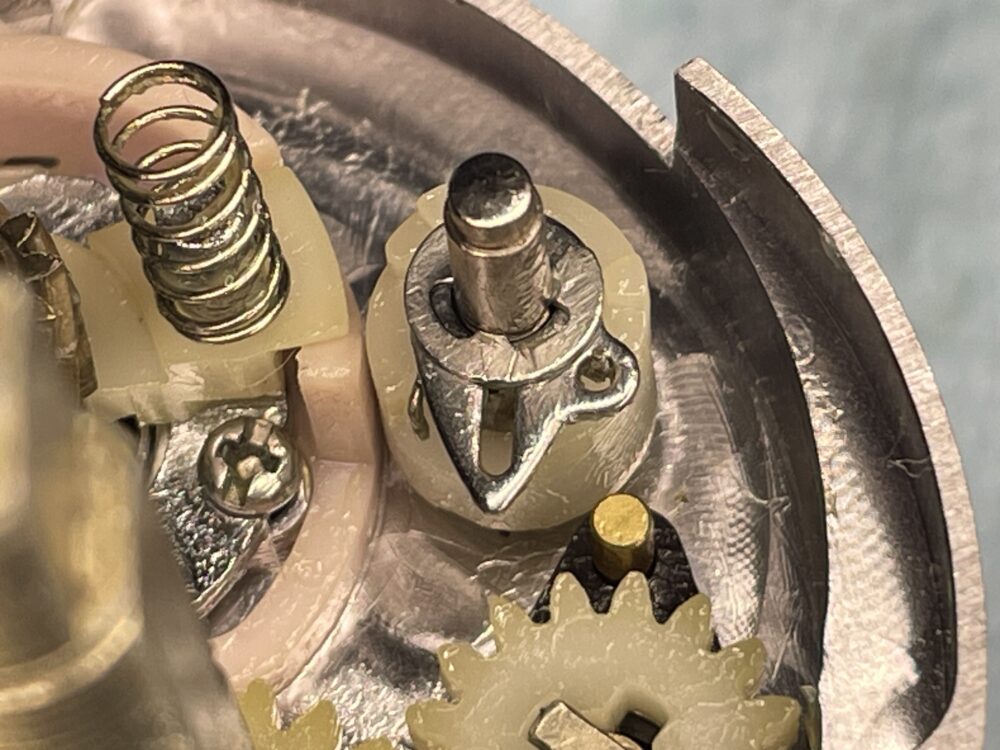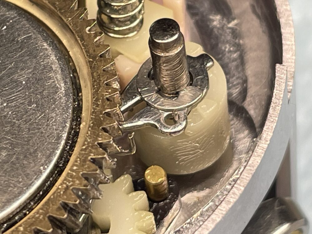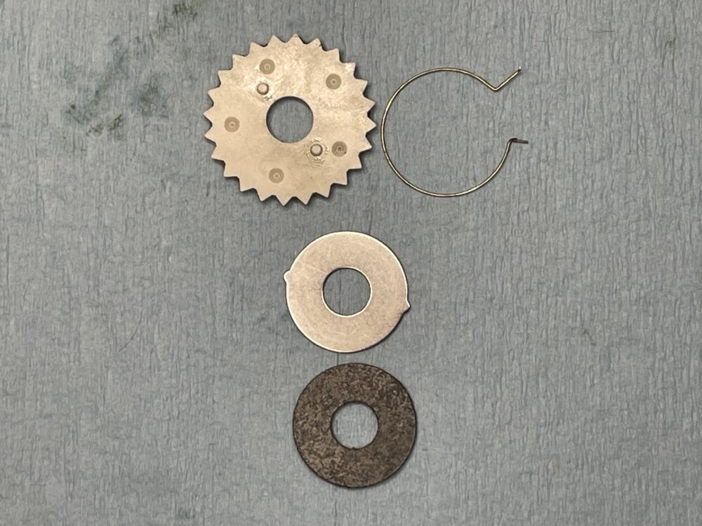 (実際の整備ではドラグ音出シラチェットはドライブギアと一緒に抜けますので、この画像の様な状態にはならないかと思いますが、「ドラグ音出シラチェットバネ」が見えやすいようにドライブギアまで取り外しています。)