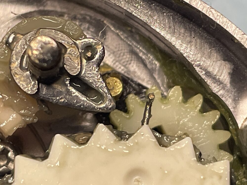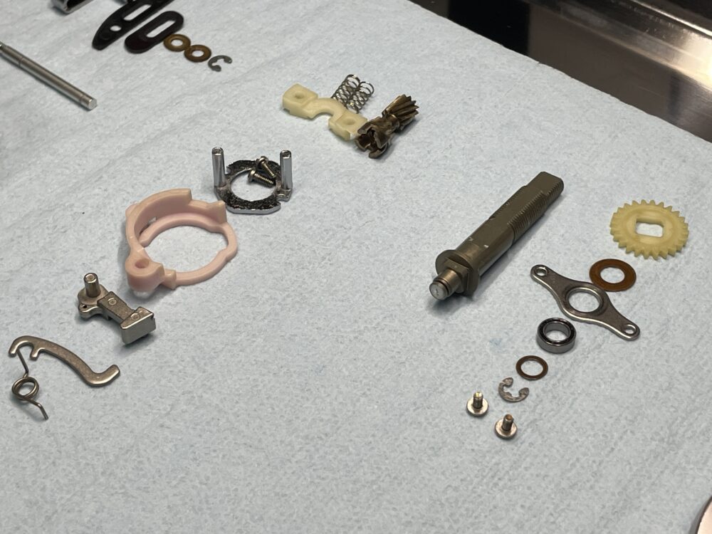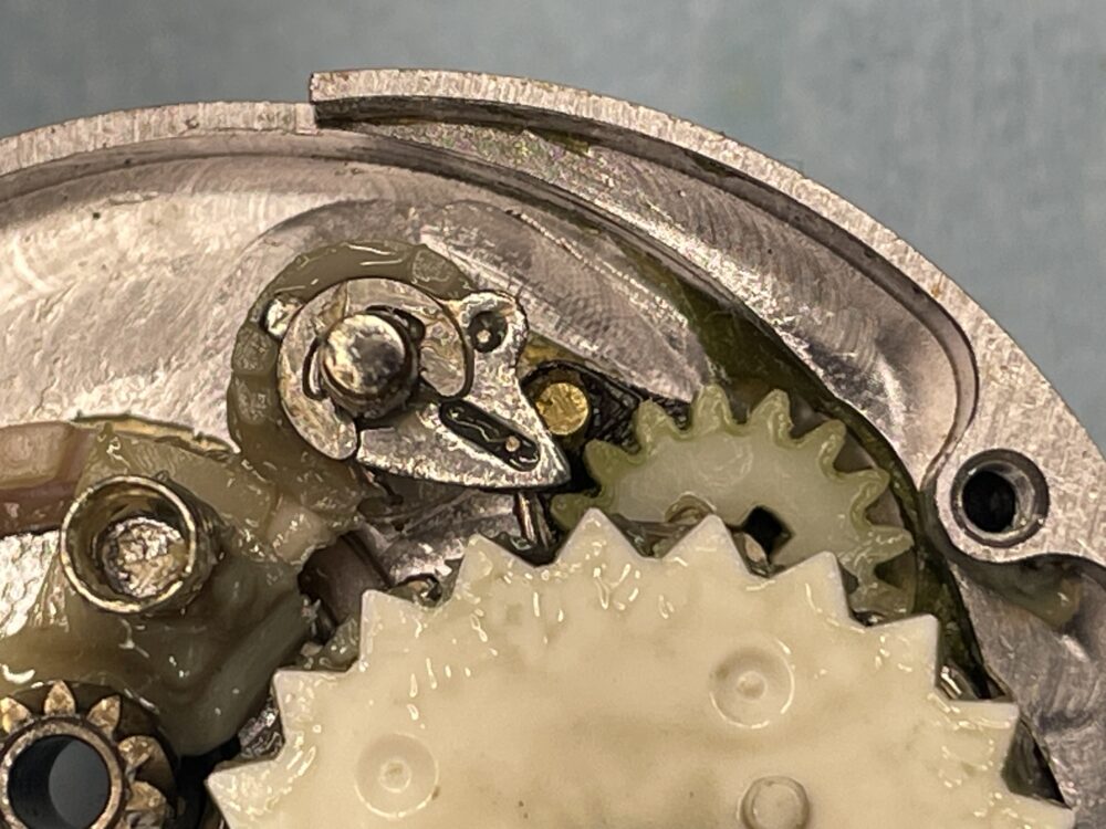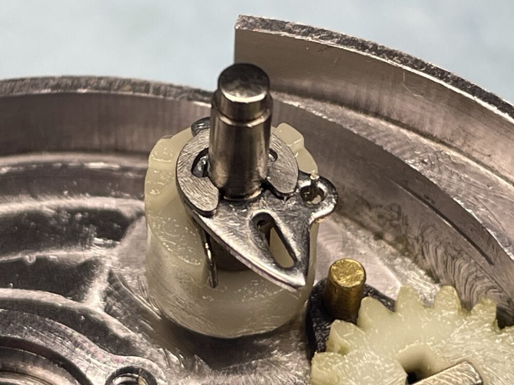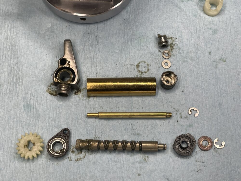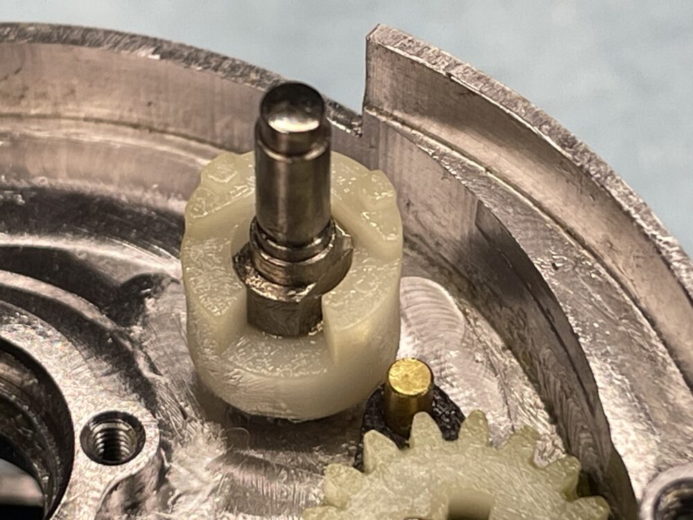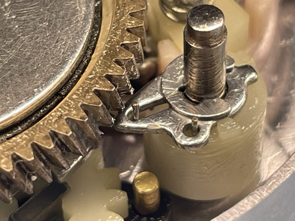 (実際の整備ではドラグ音出シラチェットはドライブギアと一緒に抜けますので、この画像の様な状態にはならないかと思いますが、「ドラグ音出シラチェットバネ」が見えやすいようにドライブギアまで取り外しています。)
