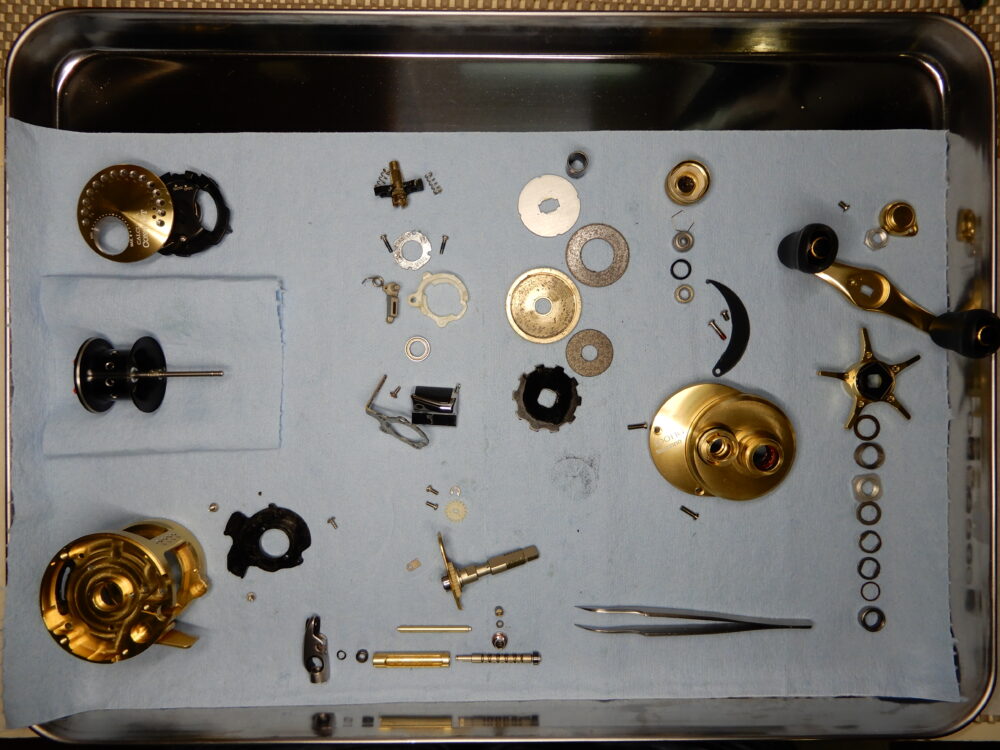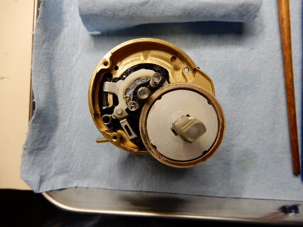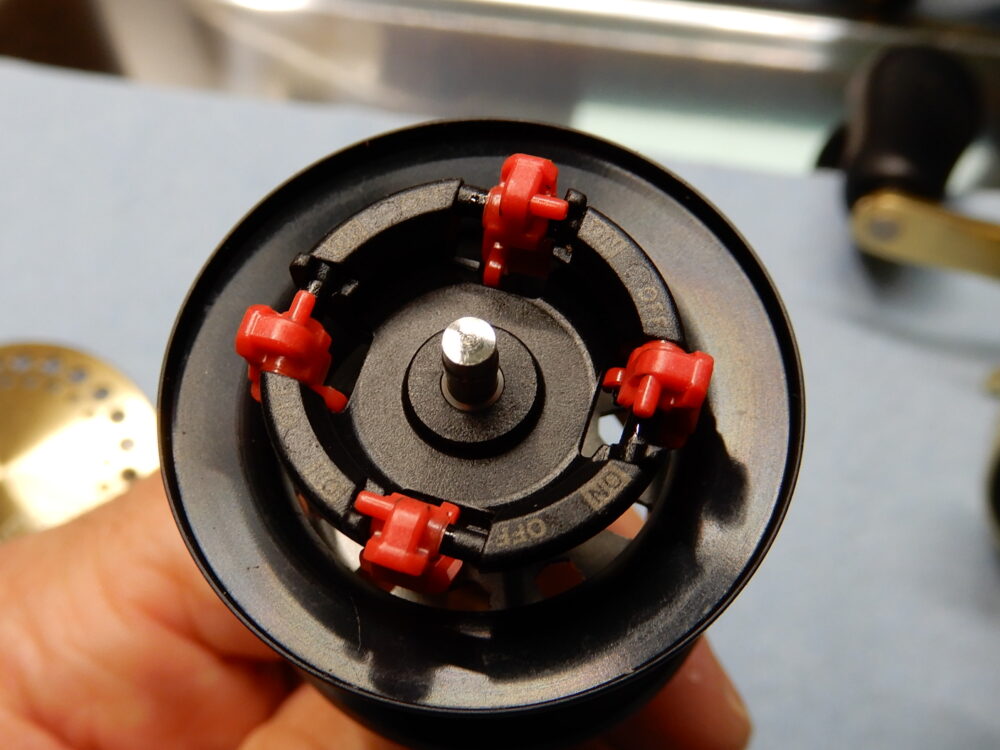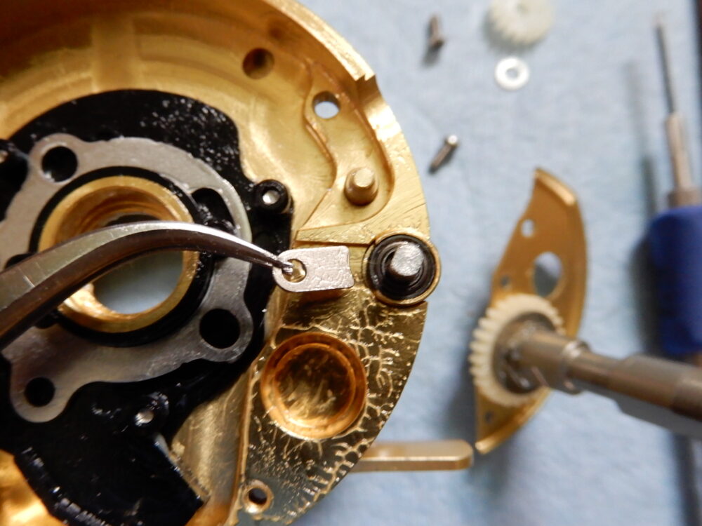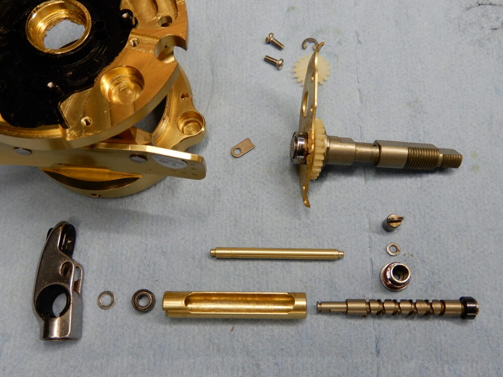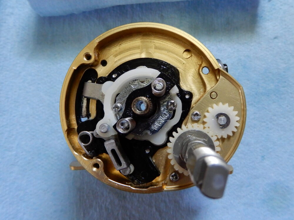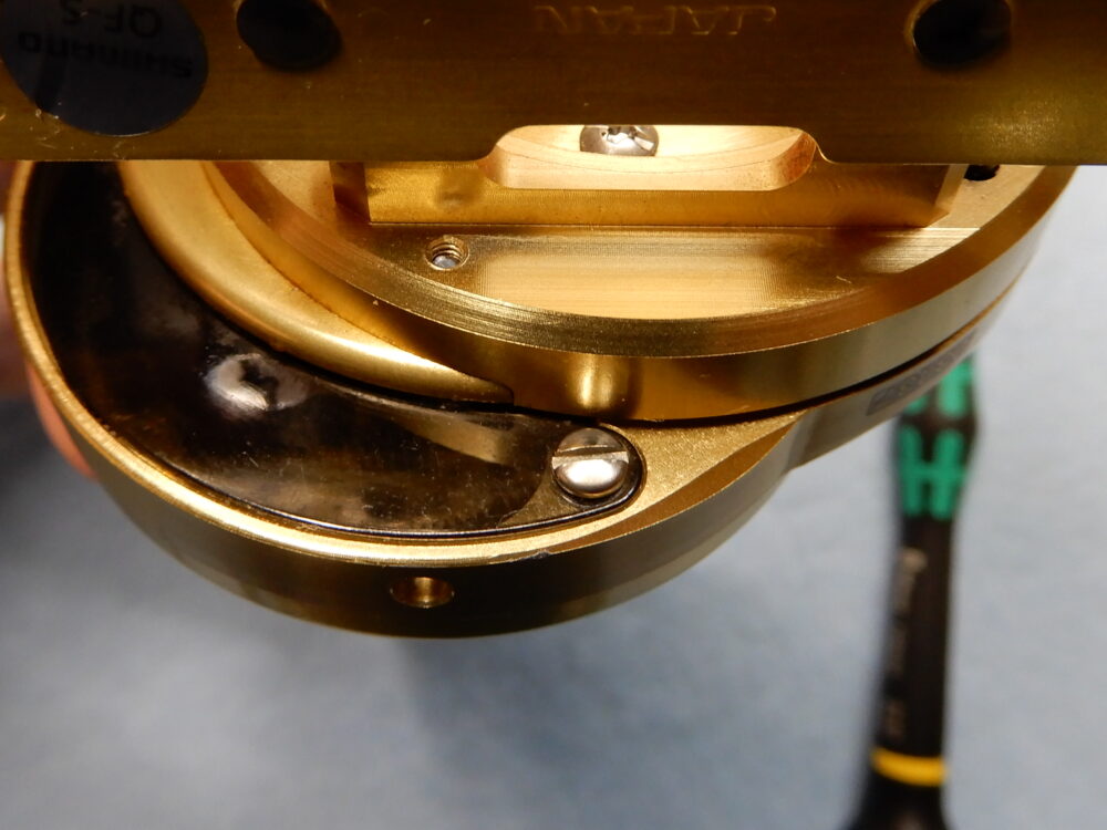 今回の私のやり方は、ウォームシャフトを回しながら少しづつ「レベルワインド受け」を捩じ込んで行き、「ウォームシャフトピン」と「ウォームシャフト」が噛み合っていることを確認できてから「レベルワインド受け」を締め込みました。