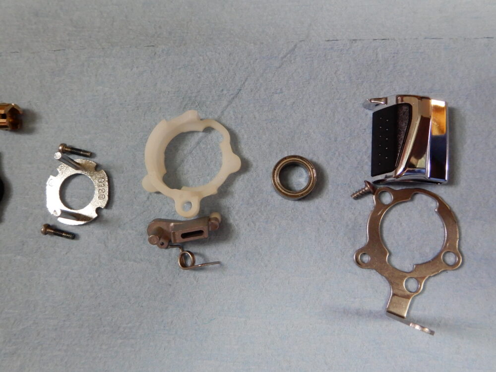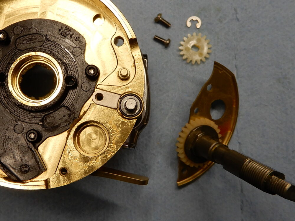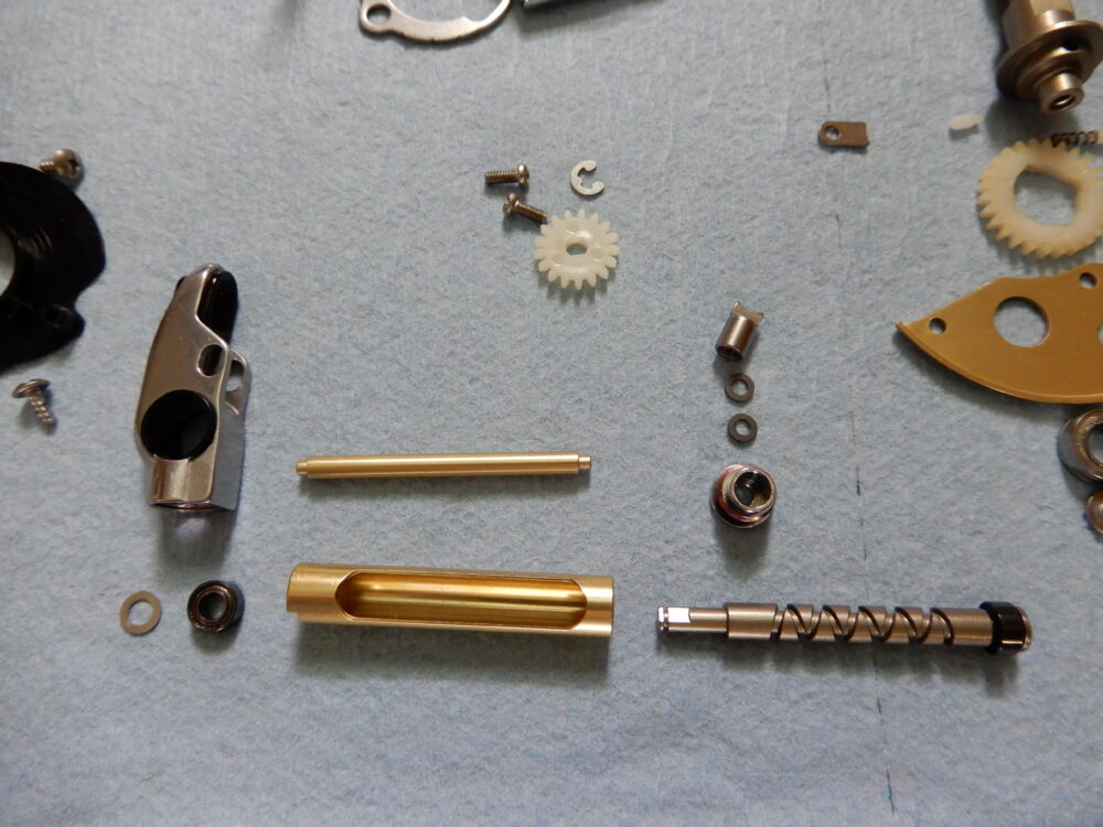 左画像の小さい部品が「ウォームシャフト抜け止め」です。これとドライブギア軸下のプレート「ドライブギア軸固定板」でレベルワインド関係の部品が固定されています。