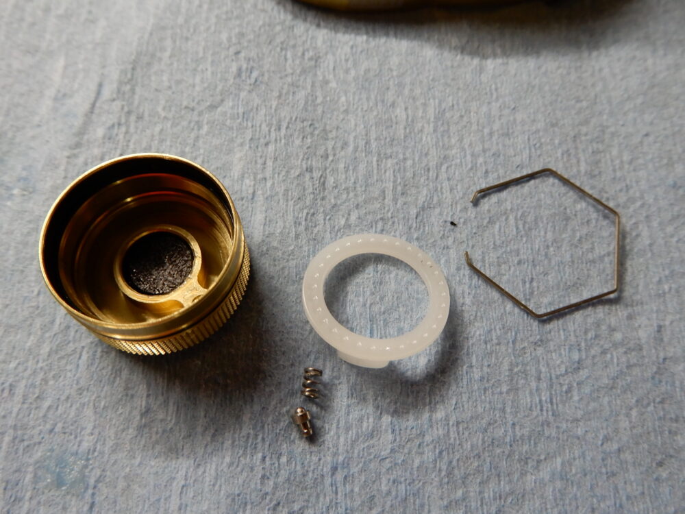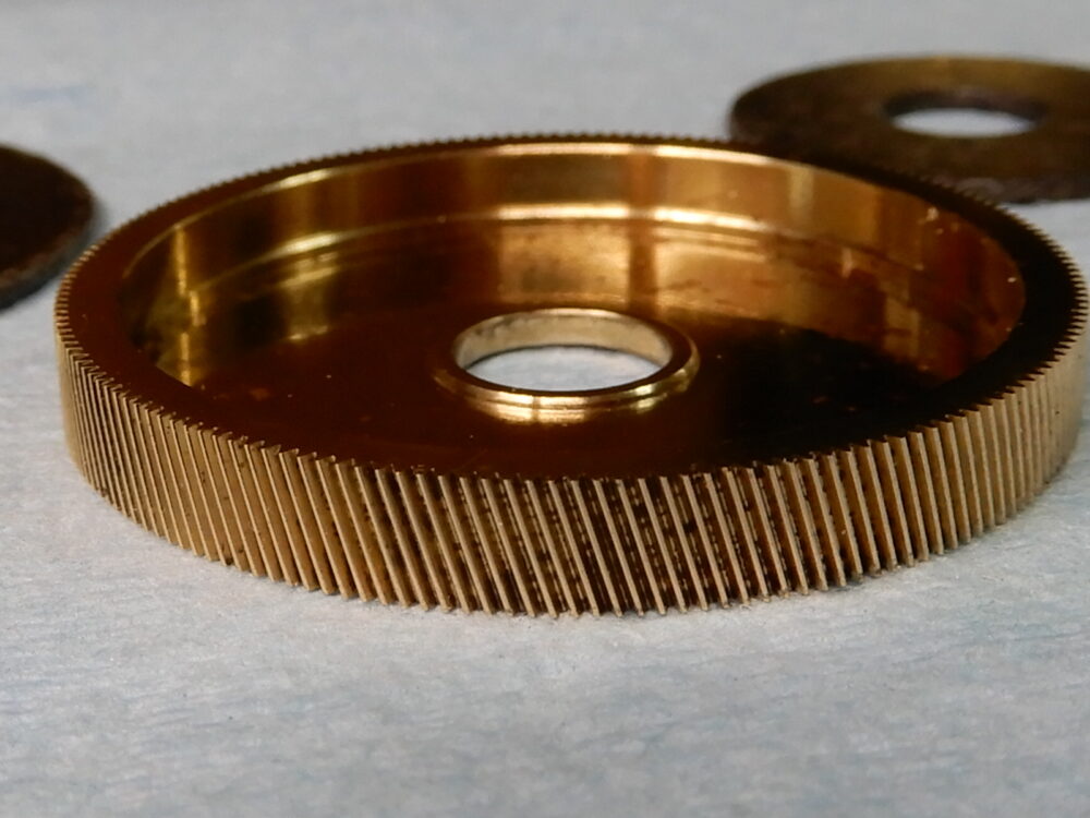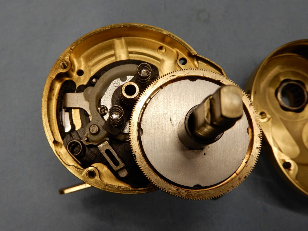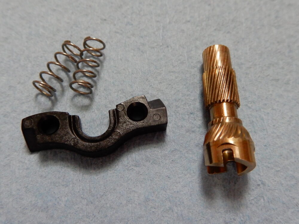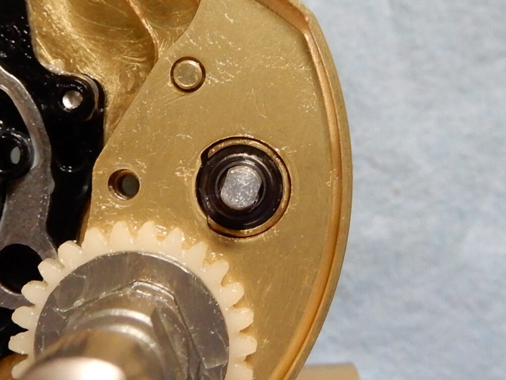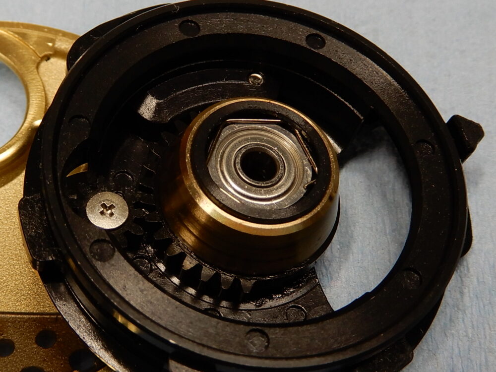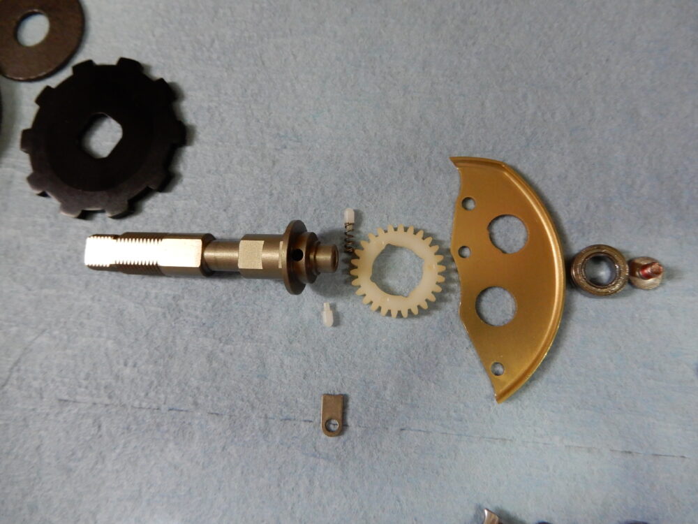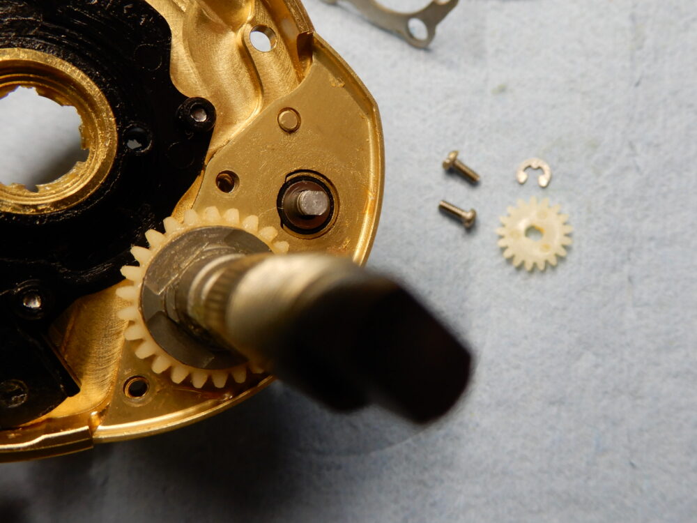 ドライブギア軸の画像でトルクリミッターのギミックが確認できます。ウォームシャフトギアに負荷がかかるとピンが引っ込んでドライブギア軸との縁を切る仕組みです。