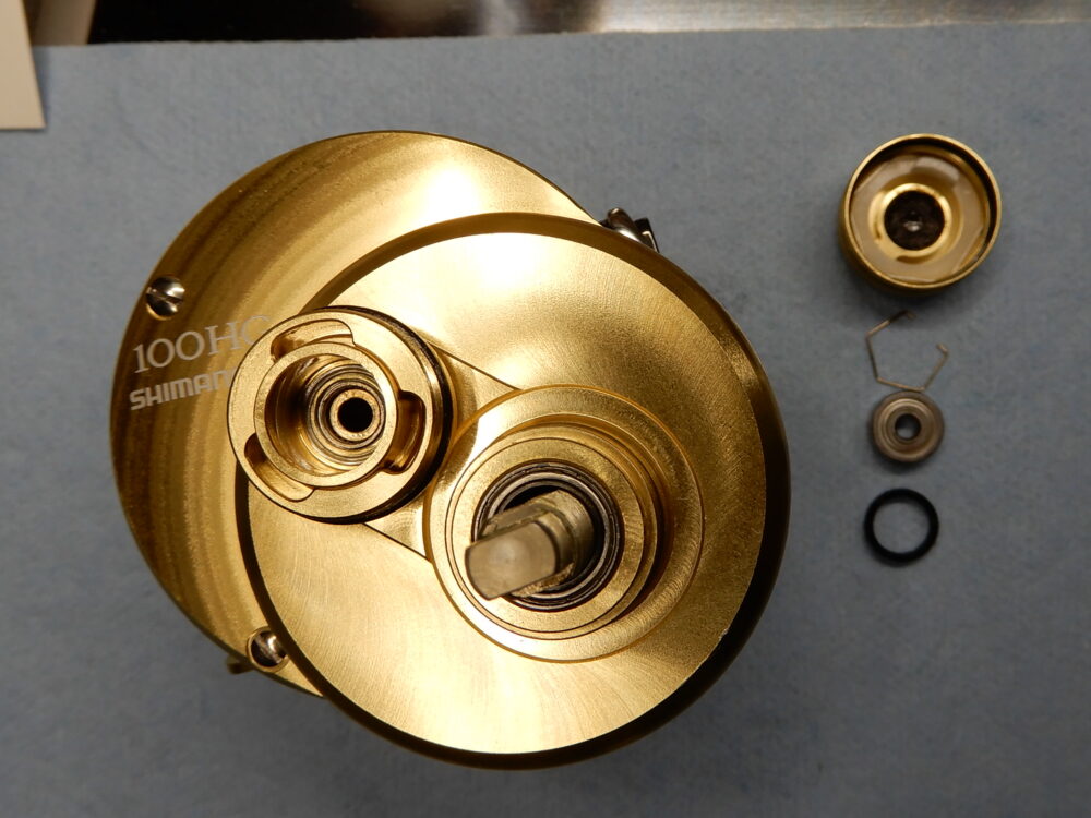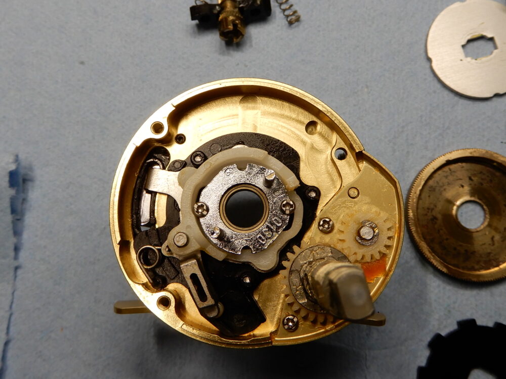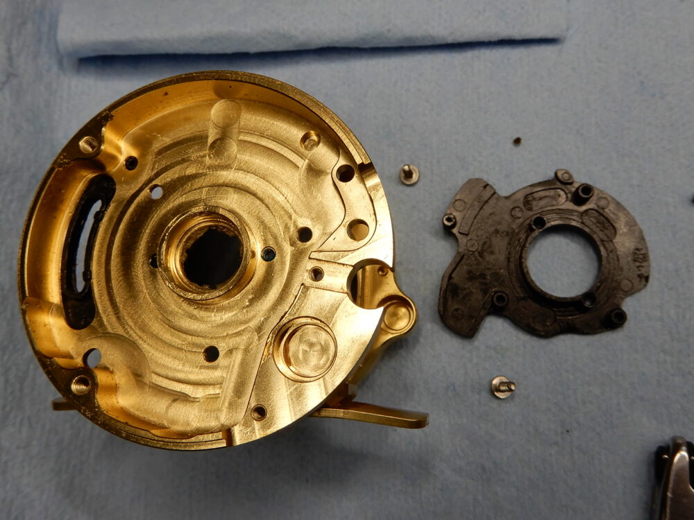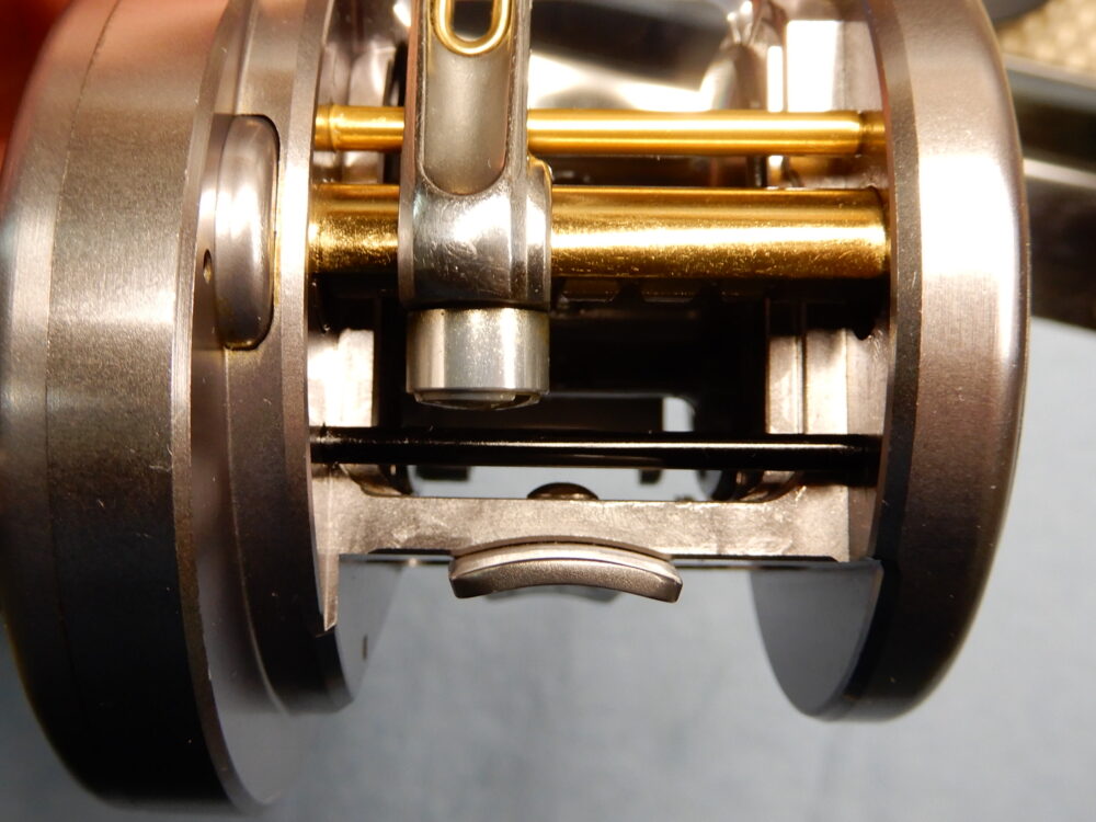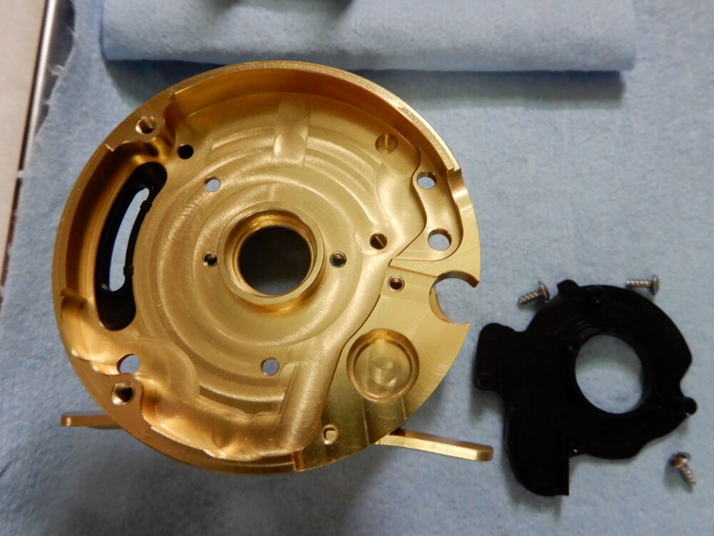 「レベルワインド組」の蓋となる「レベルワインド受け」、これを「レベルワインド組」の内側にねじ込む形になっています。09-11モデルまでは「レベルワインド組」の外側にネジが切ってあり、「レベルワインド受け」を被せる形で取り付けるようになっていました。