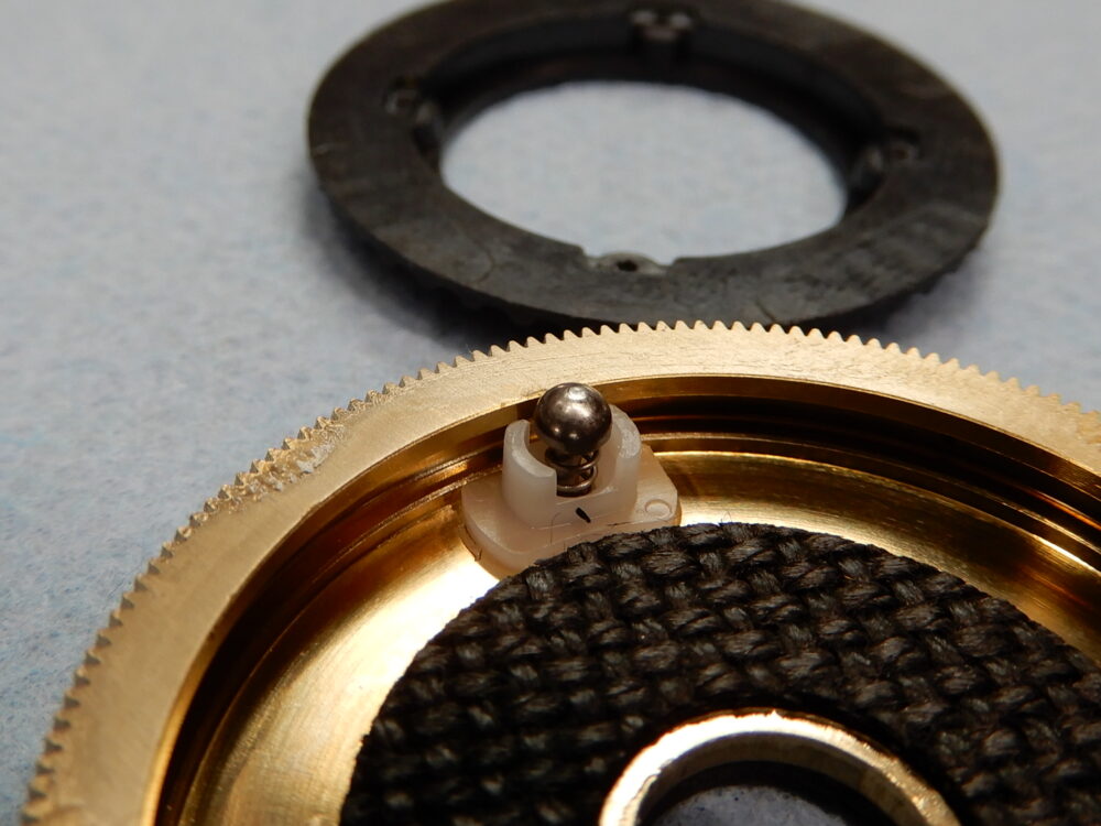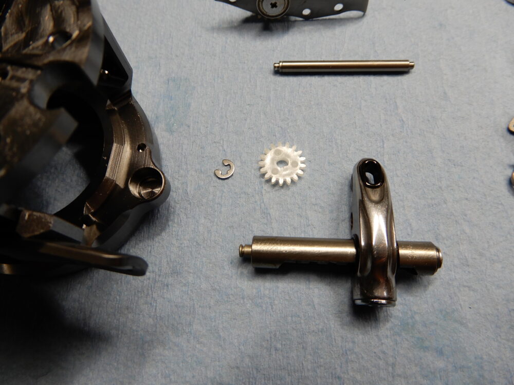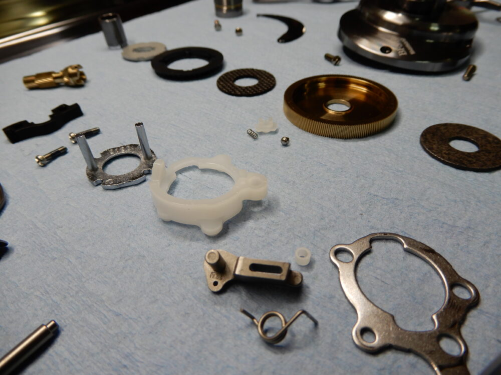 こちら「ドラグ音出しピン」です。上の黒い部品は「ドラグ音出しラチェット」です。