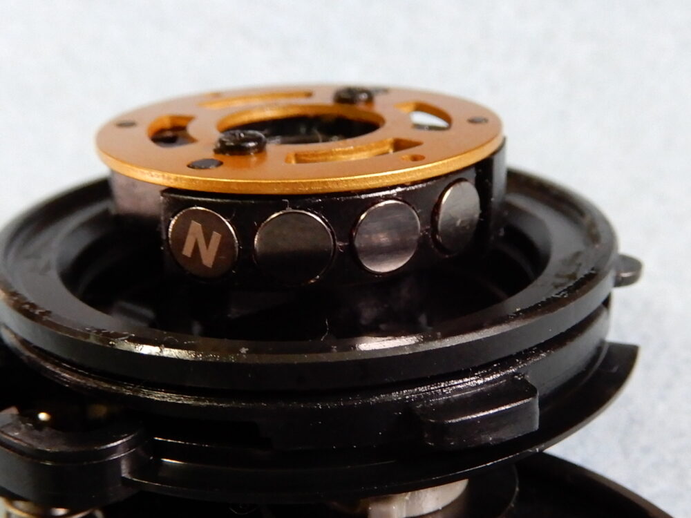 ブレーキユニットの6〜8個のマグネットでスプール自体に直接ブレーキを掛ける仕組みです。スプールにブレーキパーツ等(磁力を受ける部品等)が付いていない為、スプールは驚きの軽さになっています。