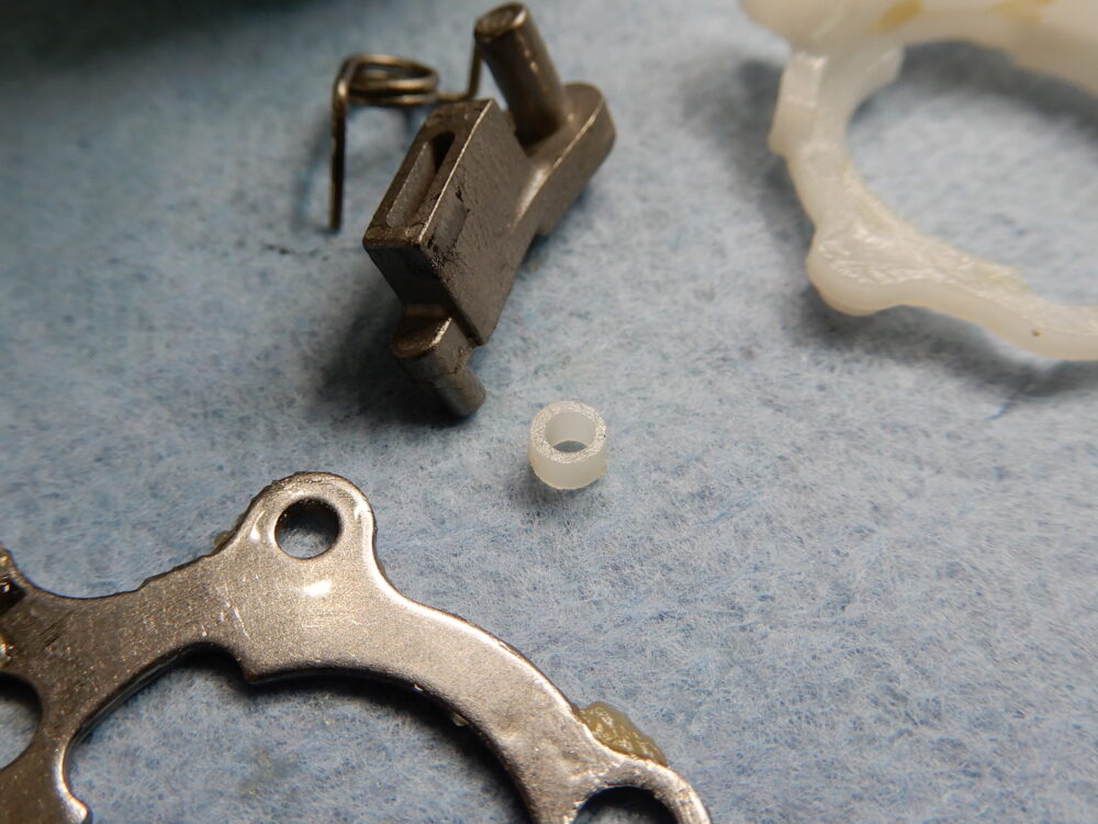 この白い部品「クラッチツメブッシュ」紛失の恐れ大です。特に白いウエスやタオルの上で作業する場合!ご注意ください。
