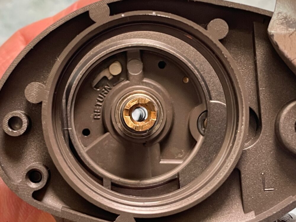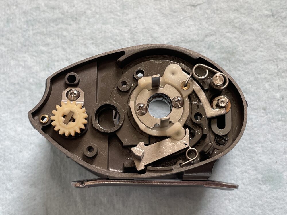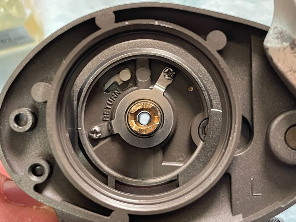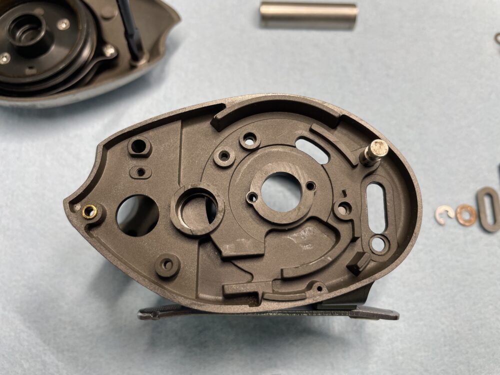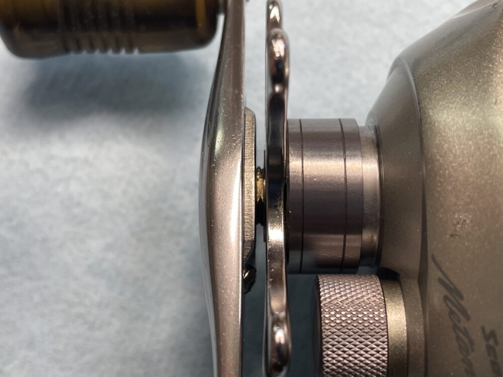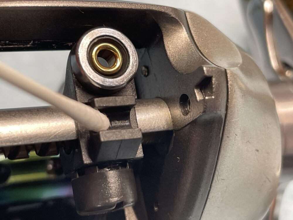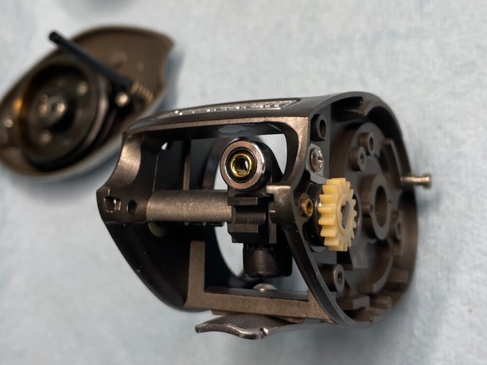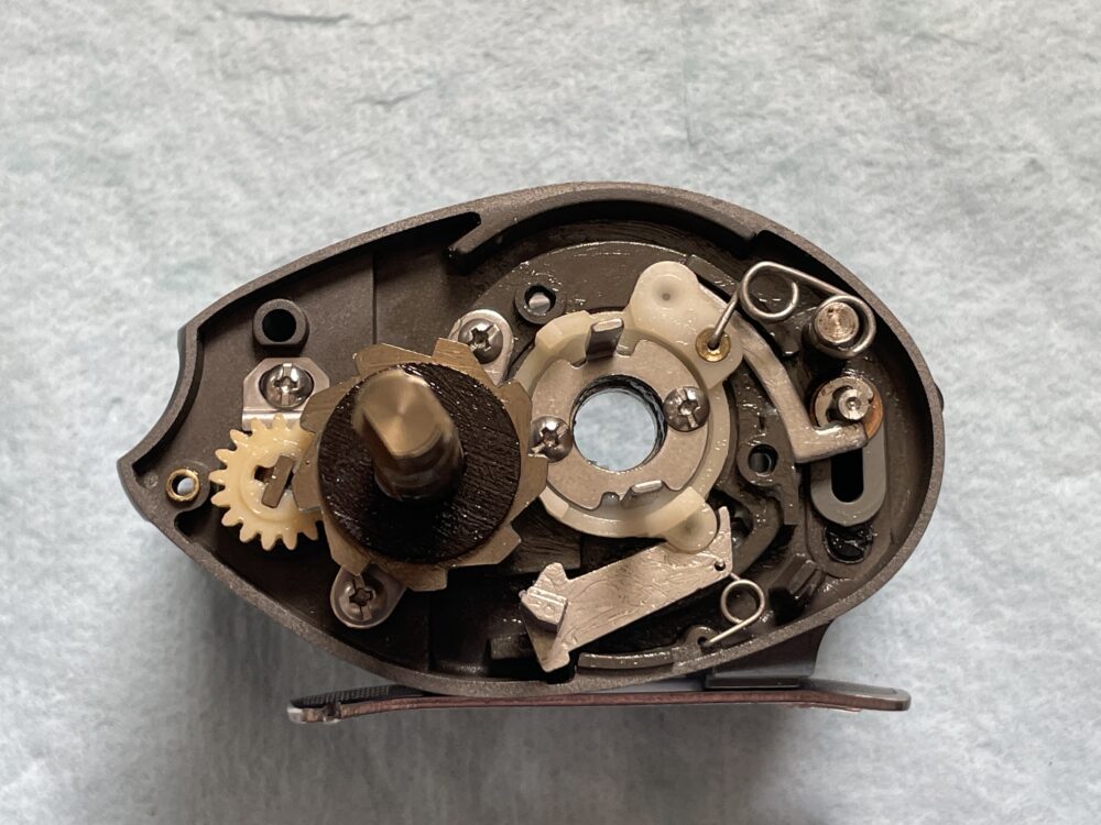 銀メタでは、ピニオンギアがベアリングで支持されており、スプール軸がピニオンギア内面に接触しない構造になっています。ここが一番の進化点かと思います。