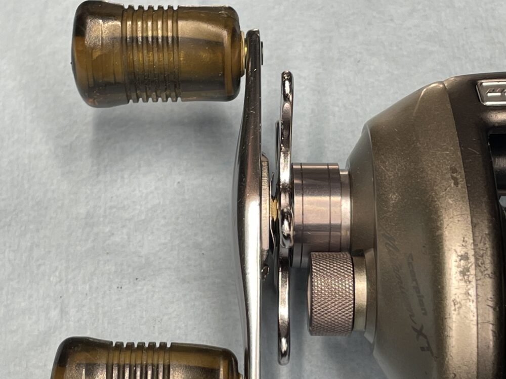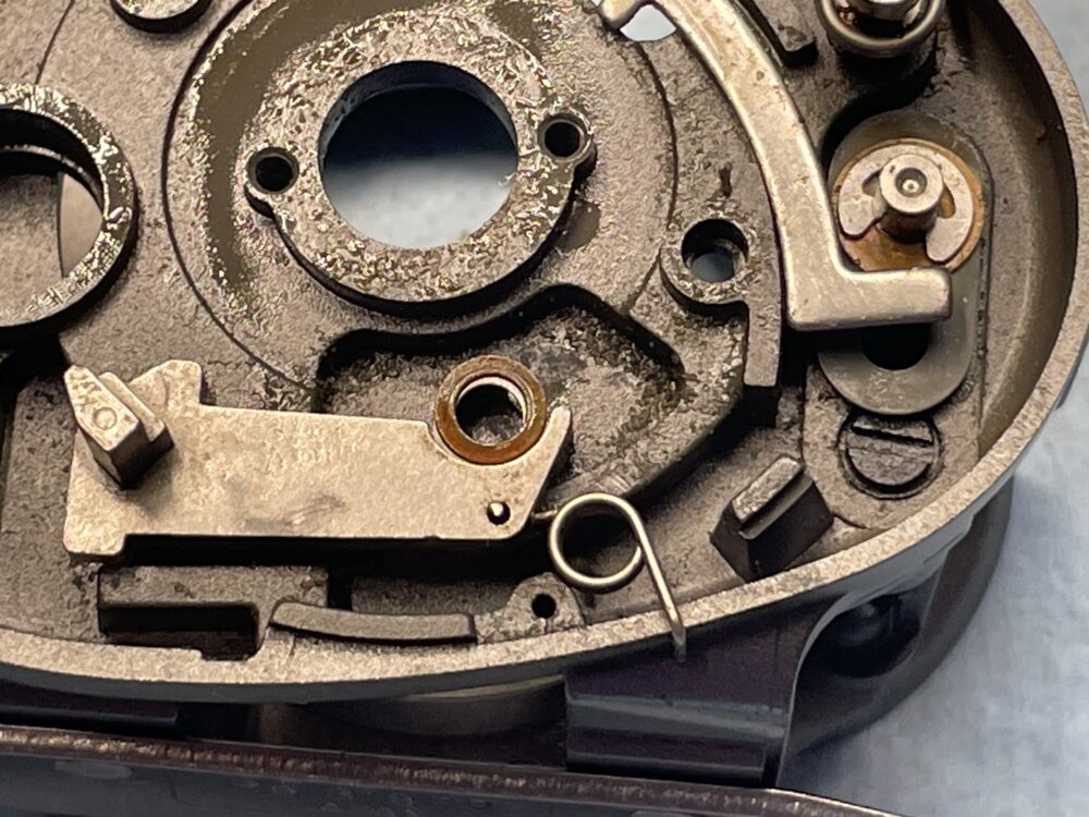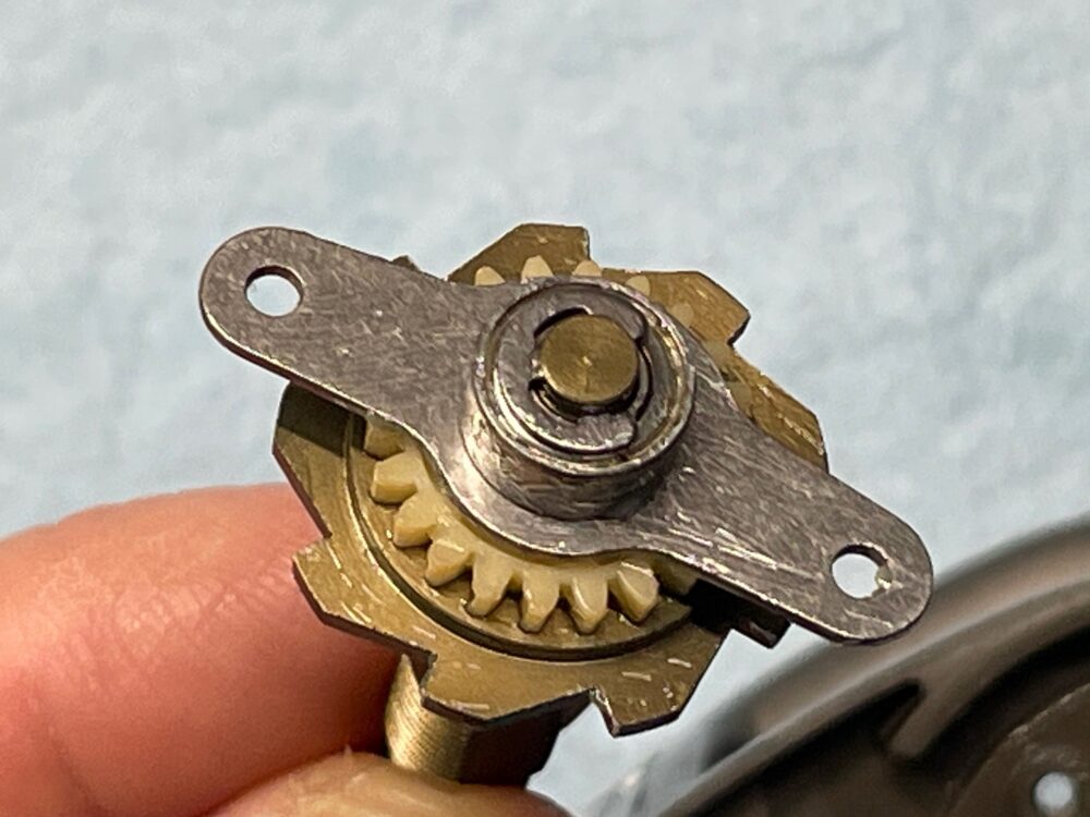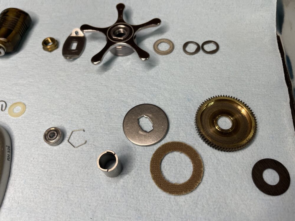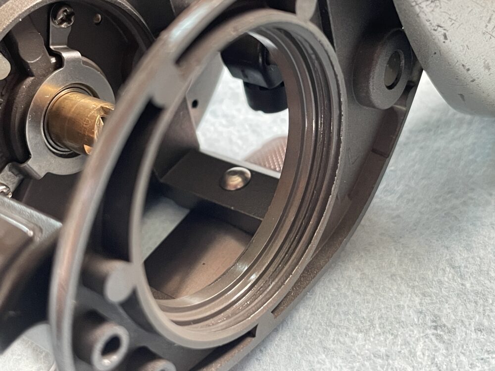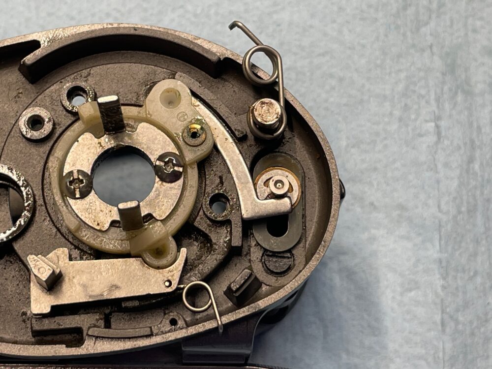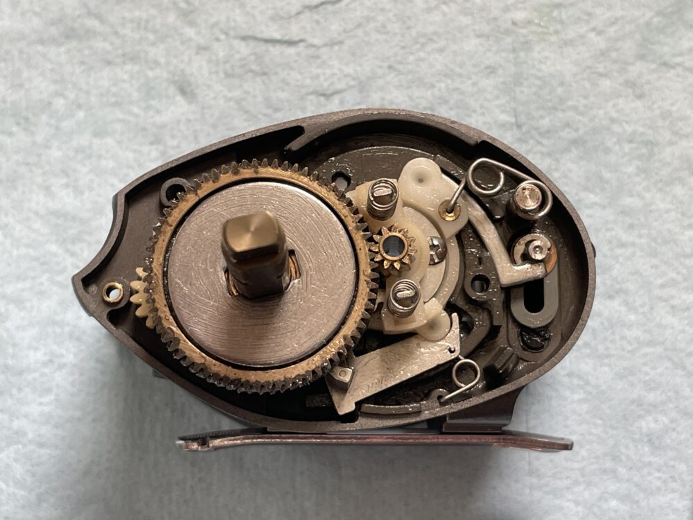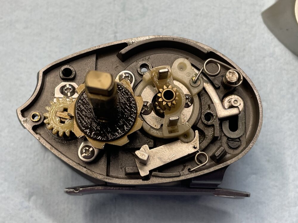 銀メタでは、ピニオンギアがベアリングで支持されており、スプール軸がピニオンギア内面に接触しない構造になっています。ここが一番の進化点かと思います。