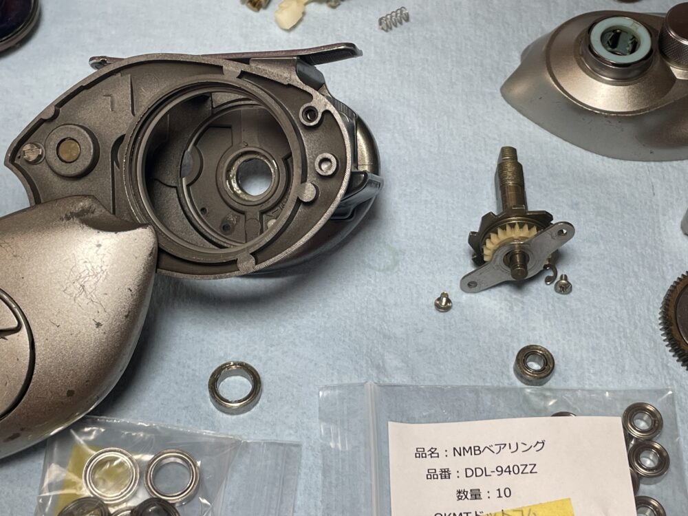 取り換えていなかったドライブギア軸下のベアリングと、ピニオンギアを支えるベアリングを取り換えました。