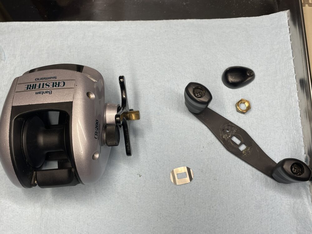 「ハンドル受ケ座金」が無くなっていますが、実釣に影響は無いかと思いますのでこれで良しとします。( → 後日他機種の物を取り付けました。記事の最後に追記しています。)